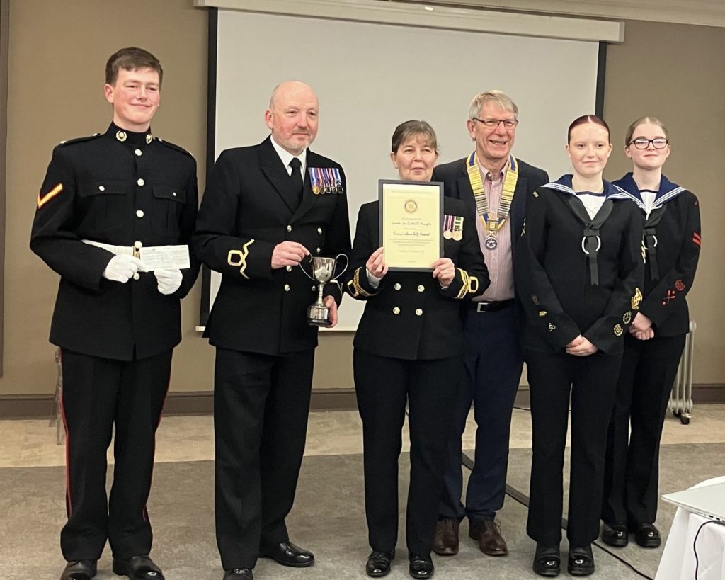 Each year Bailgate Rotary Club awards a throphy and a cheque for £200 to either an individual or a group whom in the opinion of the club has gone the extra mile with their service to society. This year it has been awarded to the LIncoln Sea Cadets charity who are based on the Brayford Pool in Lincoln. The staff of volunteers instruct and educate young people from 10 years of age to 18 years of age in life skills for the future. These include discipline, leadership, self confidence, qualifications for the future, honesty and respect in a Sea Cadet and Marine cadet environment. Lt Cdr (SCC) Louise Everett RNR and SLt (SCC) Andrew Kirk (RNR) introduced 3 of their senior cadets to the club who each gave a very inspiring talk about their experiences and time so far in the Sea Cadets and the Royal Marine Cadets. Over the years these Cadets have won a number of National competitions in Drill and sailing a great credit to them and the volunteers that run the charity.